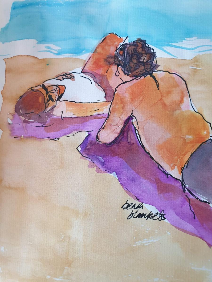 These sketches were mostly done on Manly Beach. They were done in ink and watercolour and most are very small, done in notebooks. "Fathers Day" was a commission, and "Beached" a watercolour done many years ago, in the artist's collection.